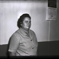 Mrs. Melvin Eslinger, president of the Twin Falls Christian Women's Fellowship of the First Christian Church, stands against a wall. She is wearing a striped button-up blouse. A calendar for the Union Pacific Railroad hangs from the wall.