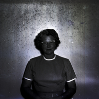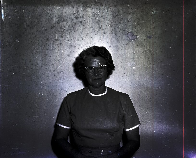 Mrs. Eldred Taylor, president of the Countryside Flower Club, stands in a hallway. She is wearing a dress.