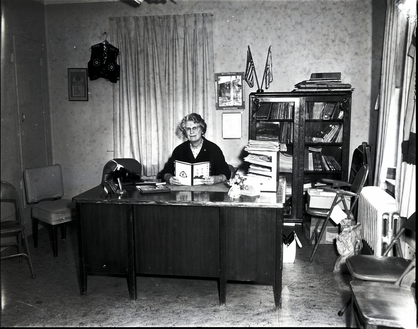 Mrs. James Vandenbark, executive director of the Twin Falls Camp Fire Girls Council, sits behind a desk in an office. She is wearing a jacket over a blouse, with a pin in the collar, and is holding the Camp Fire Girls handbook. On the desk are some books, photographs, a telephone, a pot of flowers, and an organizer filled with papers. In the corner is a bookcase filled with books, and on top of the bookcase are a small American flag and another flag. Some framed pictures hang from the wall. Behind the desk is a window covered in drapes, and a vest hangs from the corner. Several folding chairs are against the walls of the room.