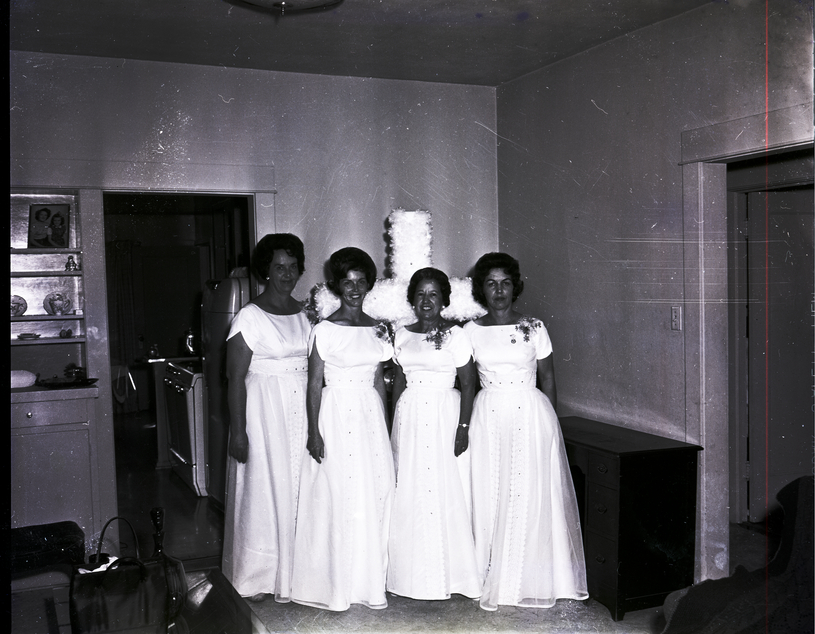 Officers of OES number 82 model their chapter gowns in a living room. From left to right are Mrs. Howard Ehresman, conductress, Mrs. Donald Sonius, associate conductress, Mrs. Norman Webb, associate matron, and Mrs. Joseph McMillan, worthy matron. The four women are all dressed in white gowns and corsages. Behind them is a white cross. A cabinet is in the corner, and on it are a framed photograph and some china. A purse is on the floor. A desk is against a side wall. The kitchen is seen through a doorway.