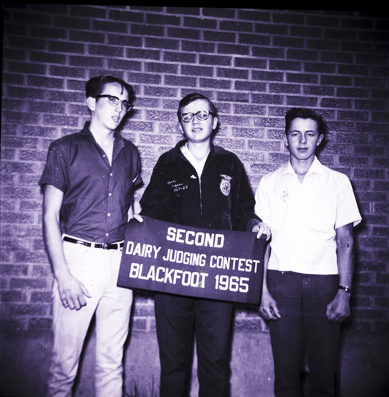 Three members of the Declo FFA chapter hold up a banner reading "Second Dairy Judging Contest, Blackfoot 1965" after winning second place in the Eastern Idaho State Fair dairy judging contest. From left to right are Edward Hatch, Max Fuqua, and Stanley Schiewe. Max Fugua is wearing his FFA jacket.