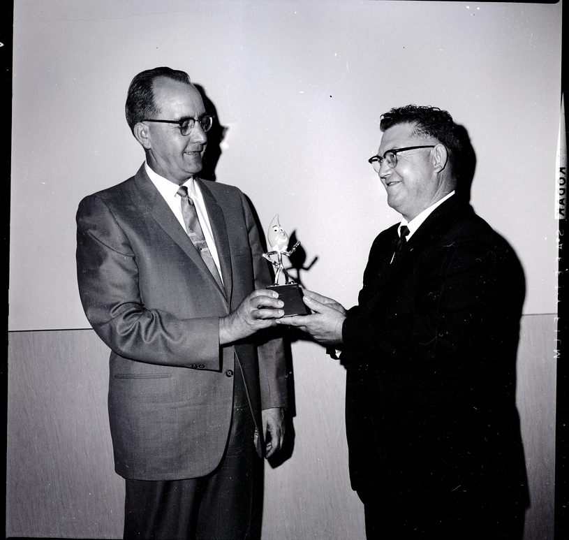 Standing to the right, H. L. Derrick, city manager, awards Twin Falls City Commission Chairman Egon Kroll with the "A" Award, a trophy that looks like a stick figure man with a teardrop-shaped head. The award was given to the city of Twin Falls during the