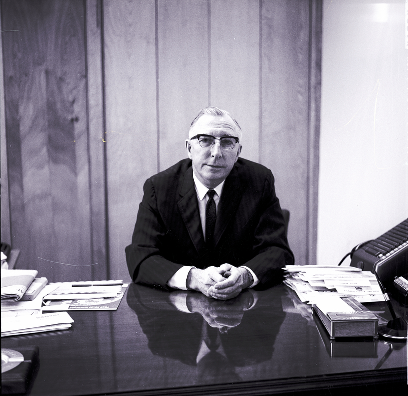 - Lyons Smith, general manager of Ida Gem Dairymen, Inc., sits behind a desk. He has served as a representative of the dairy industry in the Magic Valley. He is dressed in a suit and tie. Various papers and office supplies are on the desk.