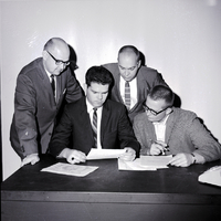 Studying the amount spent by the Twin Falls Red Cross chapter during 1964 are four board of directors of the chapter. From left to right are William Boyd, public information chairman; William K. Evans, vice chairman; LuDell Waldron, treasurer; and Milo Pope, chairman. The Twin Falls chapter is a participating agency of the United Fund. The four men are dressed in suits and ties. A telephone sits on the desk.