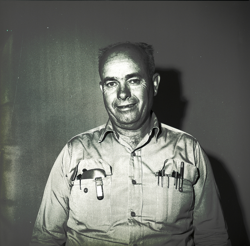 Claude H. Pair spoke about the development of land under sprinkler irrigation in the Snake River Plain as a big business during the Western annual meeting of the American Society of Civil Engineers and American Society of Agricultural Engineers held in Twin Falls. He is wearing a button-up shirt with several pens, a comb, and a case in the front chest pockets.