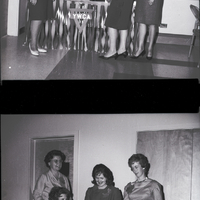 In the top image, three women gather in front of a display at a YWCA Wives Club event. On the display table are a male and female doll. Streamers hang from the side of the table with a YWCA logo. On the wall behind the display is a star with three strips of colored papered running down the wall reading "Past" "Present" and "Future." In the bottom image, four women gather around a table covered in a lacy tablecloth. Mrs. Lynn Popplewell is seated by the table in a folding chair and pours coffee from a silver coffee pot into a cup. Standing beside the table, from left to right, are Mrs. Lloyd Johnson, Mrs. Ronnie Pope, and Mrs. Quinton Harral. On the table are glass trays, cups, napkins, a flowery centerpiece, and a candle. The women are wearing dresses and name tags in the shape of autumn leaves.