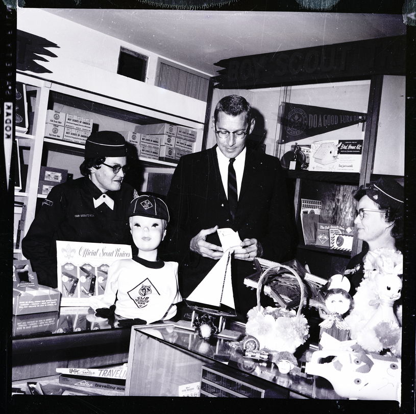 Two Den Mothers for the Cub Scouts meet with a man at the Idaho Department Store to publicize the Den Mother's Workshop. From left to right are Mrs. Gerri Smith, Robert Harvey, Idaho Department Store manager, and Mrs. Nina Fisher. The women are wearing their uniforms, and Mr. Harvey is dressed in a suit and tie. Several toys and collectibles sit on top of a glass display case. On the adjacent counter a mannequin bust is dressed in a Cub Scout hat and t-shirt. A display behind the mannequin head shows several official scout knives. In the back of the room is a pennant that reads "Boy Scouts of America, Do a Good Turn Daily." Below it is a shelf that has a trophy, bird house kit, and some Cub Scout supplies. Shelves in the back of the room contain boxes of official Cub Scout shirts from the Boy Scouts of America.