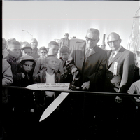 Chairman of the Twin Falls County Commission Morris Carlson, dressed in a suit, tie, and jacket, holds a large pair of scissors that reads "Interstate 80 N - Jerome to Burley Opened Oct. 14, 1966. - Cost: $20,750,000.00 - Length: 43.3 mi." at a ribbon cutting ceremony during the Jerome Road dedication. A man in a suit and tie stands beside him, wearing a ribbon that says "Official." A crowd of men, women, and children have gathered to watch. In the background, a man in a hat stands on a truck to get a good view of the proceedings.
