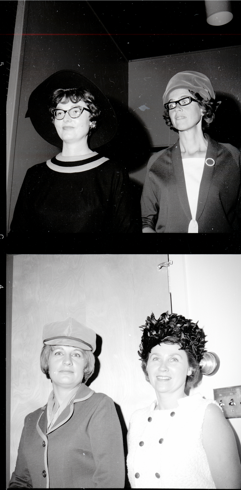 Women gather at a Christian Women's Club luncheon held at the Twin Falls YWCA. In the top image, the woman on the left is wearing a black dress with a wide-brimmed black hat, and the woman on the right is wearing a jacket over a blouse with a beanie. In the bottom image, Mrs. Wayne Rose is wearing a blazer and a cap, and Mrs. Ron Booth is wearing a white dress with a black hat covered in black feathers. The hats modeled were from The Paris in Twin Falls.