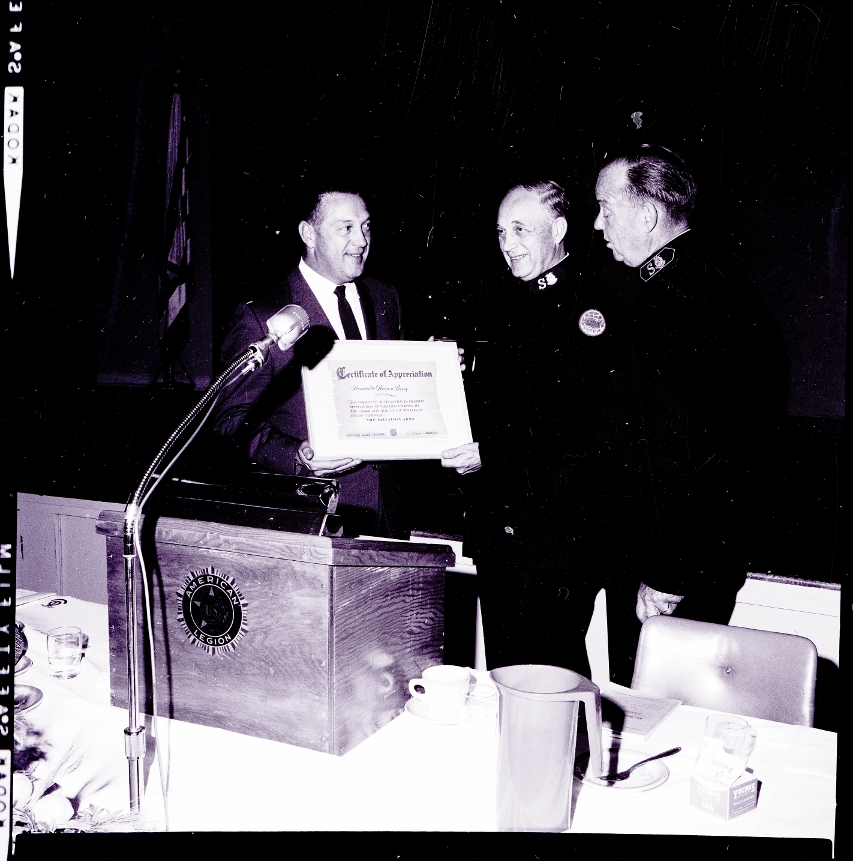 Lt. Col. John Erickson, divisional commander of the Oregon-Southern Idaho Division of the Salvation Army, awards Warren Barry with the Civic Award. Col. Emil Nelson, field secretary in the Western Territory of the Salvation Army, watches. The certificate reads "Certificate of Appreciation Presented to Warren Barry. This certificate in presented in grateful appreciation of volunteer service to the community and to the welfare of others through the Salvation Army." Warren Barry is dressed in a suit and tie, and the other two men are wearing their uniforms. They are standing behind a podium, and on the podium is a seal that reads "American Legion." Some cups, a pitcher, and a plate with a fork on it are on the table in front of them.