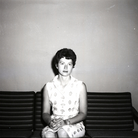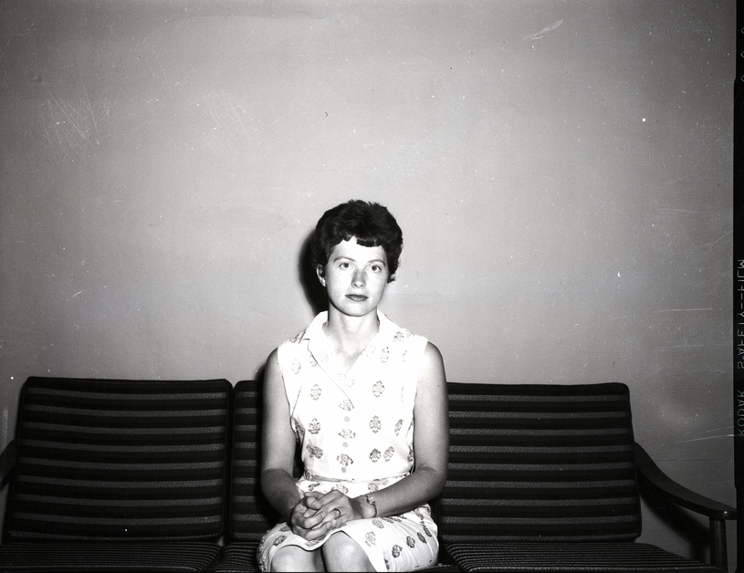 Mrs. Gary Assendrup, president of the Mentor Club, sits on a couch. She is wearing a sleeveless patterned dress.