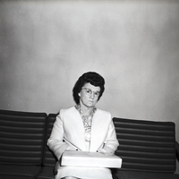 - Mrs. Morris Vavold, president of the Nazarene World Missionary Society of the Twin Falls First Nazarene Church, sits on a couch. She is wearing a blouse, jacket, and skirt. A package sits on her lap.