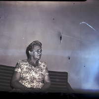 - Mrs. William C. Armga, president of the Past Oracles Club, sits on a couch. She is wearing a floral print dress.
