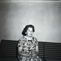 Mrs. Mary Stearns, president of the Twin Falls Triple Link Club, a subordinate to Primrose Rebekah Lodge No. 76, sits on a couch. She is wearing a floral print dress and a pearl necklace.