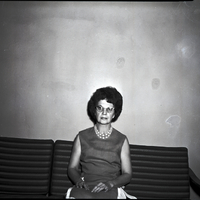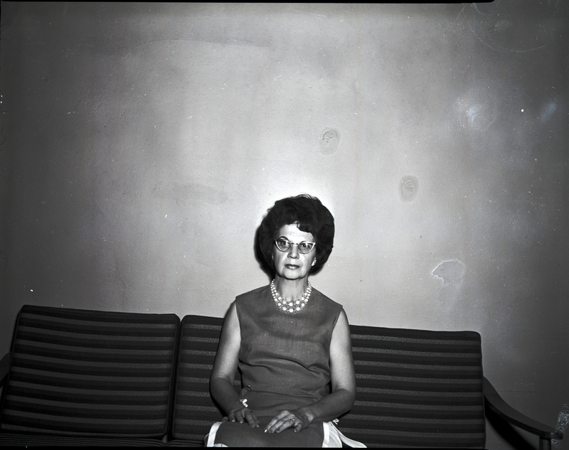 Mrs. Wesley Sonius, president of the Merry Marrieds, sits on a couch. She is wearing a sleeveless dress.