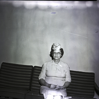 - Mrs. Robert Messenger, president of the Twin Falls Auxiliary to Veterans of Foreign Wars, sits on a couch. She is wearing a Veterans of Foreign Wars Auxiliary uniform dress and cap.