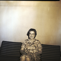 Mrs. Earl Shobe, oracle of the Vishnu Camp No. 2970 of the Twin Falls Royal Neighbors of America, sits on a couch. She is wearing a floral print dress.