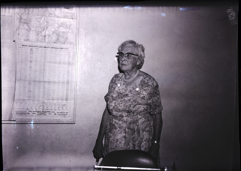 - Mrs. Jessie Davis, president of the Salmon Social Club, stands beside a wall. She is wearing a floral print dress. Hanging on the wall beside her is a map of the state of Idaho that reads "Idaho Legislative and County Officials -- 1965-1966."