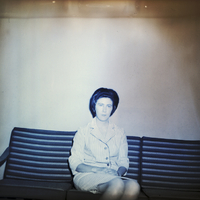 - Mrs. D. L. McFarland, president of the Twin Falls Epsilon Sigma Alpha Alpha Nu Chapter, sits on a couch. She is wearing a striped button-up dress.