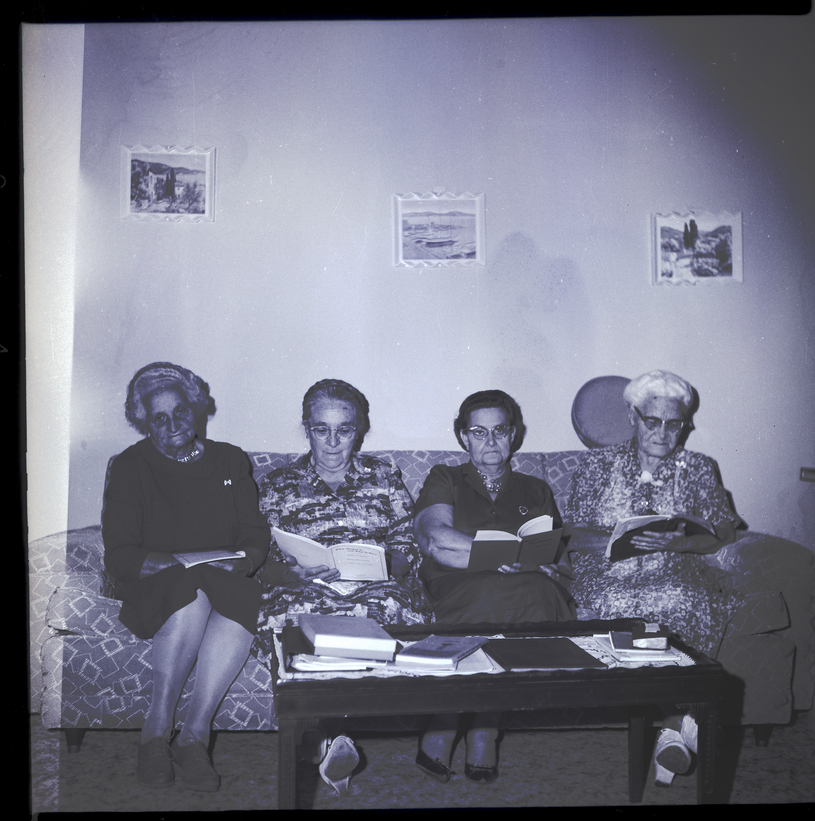 WCTU officers sit on a couch. From left to right are Mrs. Lucy Nelson, secretary, Mrs. Wesley Carrel, treasurer, Mrs. Lillian Rayborn, president, and Mrs. John Binder, spiritual life director. They are all wearing dresses, and have books in their hands. Two of the book titles read "What Alcohol Is and What It Does" and "Shadow Over America." Several other books and binders are laying on the coffee table in front of the couch. Some landscape photographs hand on the wall behind them.