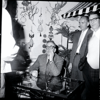 Vardis Fisher signs copies of his book "Mountain Man" at Sallie's Gifts & Books in Twin Falls. He is seated at a table, and three men stand around it. On the shelves behind him are copies of the book and various antiques and gift items.