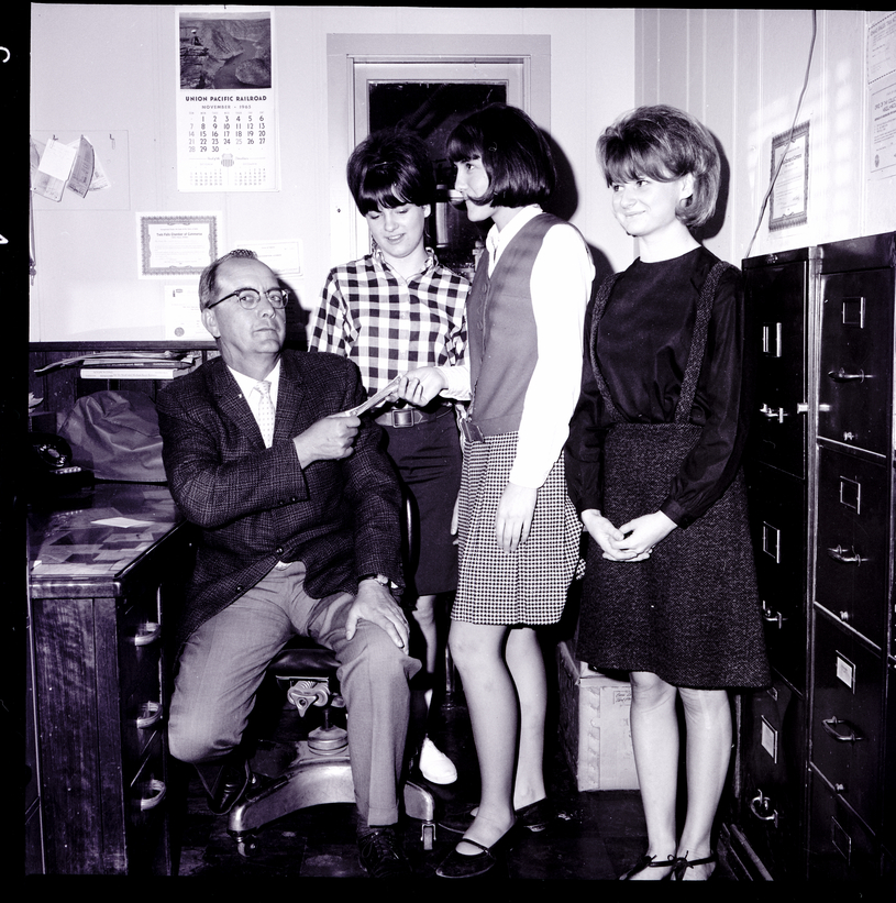 Twin Falls City Commission Chairman Egon Kroll buys a ticket to the March of Dimes Benefit Dance from TFHS Pep Club members Chris Emerick, Jerri Quigley, and another club member. Egon Kroll is wearing a suit and tie and the girls are wearing blouses and skirts. Egon Kroll is seated in an office chair behind a desk. On the wall behind him is a coat hanger, calendar, and certificate. Some file cabinets are along the side wall.