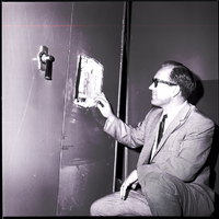 Grant Ousterhout, general manager of Reliance Credit Corp, looks at a hole in a safe door. When employees of the firm couldn't open the safe to get some files by using the combination, and after two locksmiths failed to open it, a power chisel was used. With the help of J. C. Boster, Boster Key Shop, the combination of the safe was cut out with the power chisel. Mr. Ousterhout is dressed in a suit and tie.