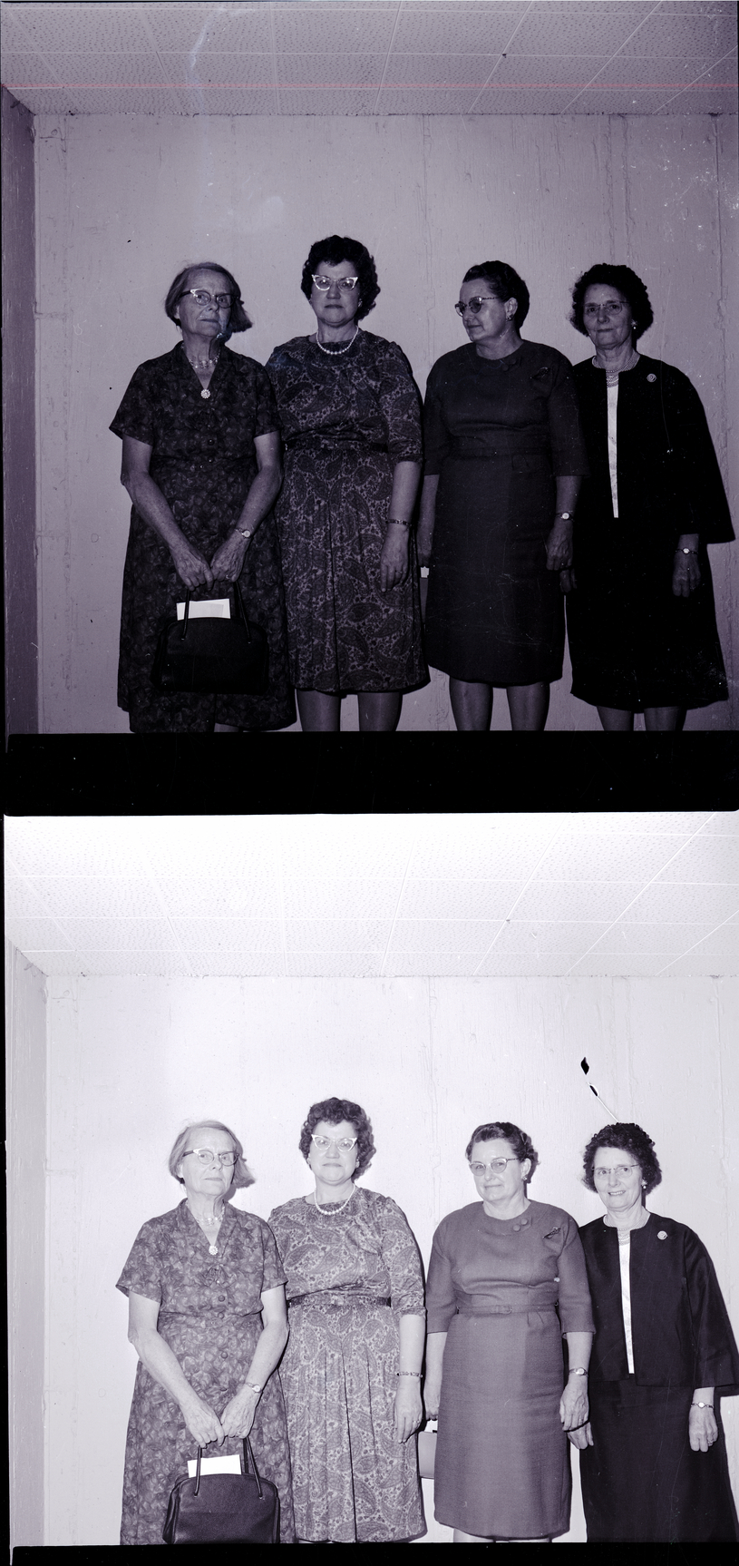 Four officers of the Magic Valley Iris Society stand in a hallway. From left to right are Mrs. C. W. Vallette, president; Mrs. Albert Toberer, vice president; Mrs. Glen Draper, corresponding secretary; and Mrs. Glenn Thietten, recording secretary. All the women are wearing dresses.