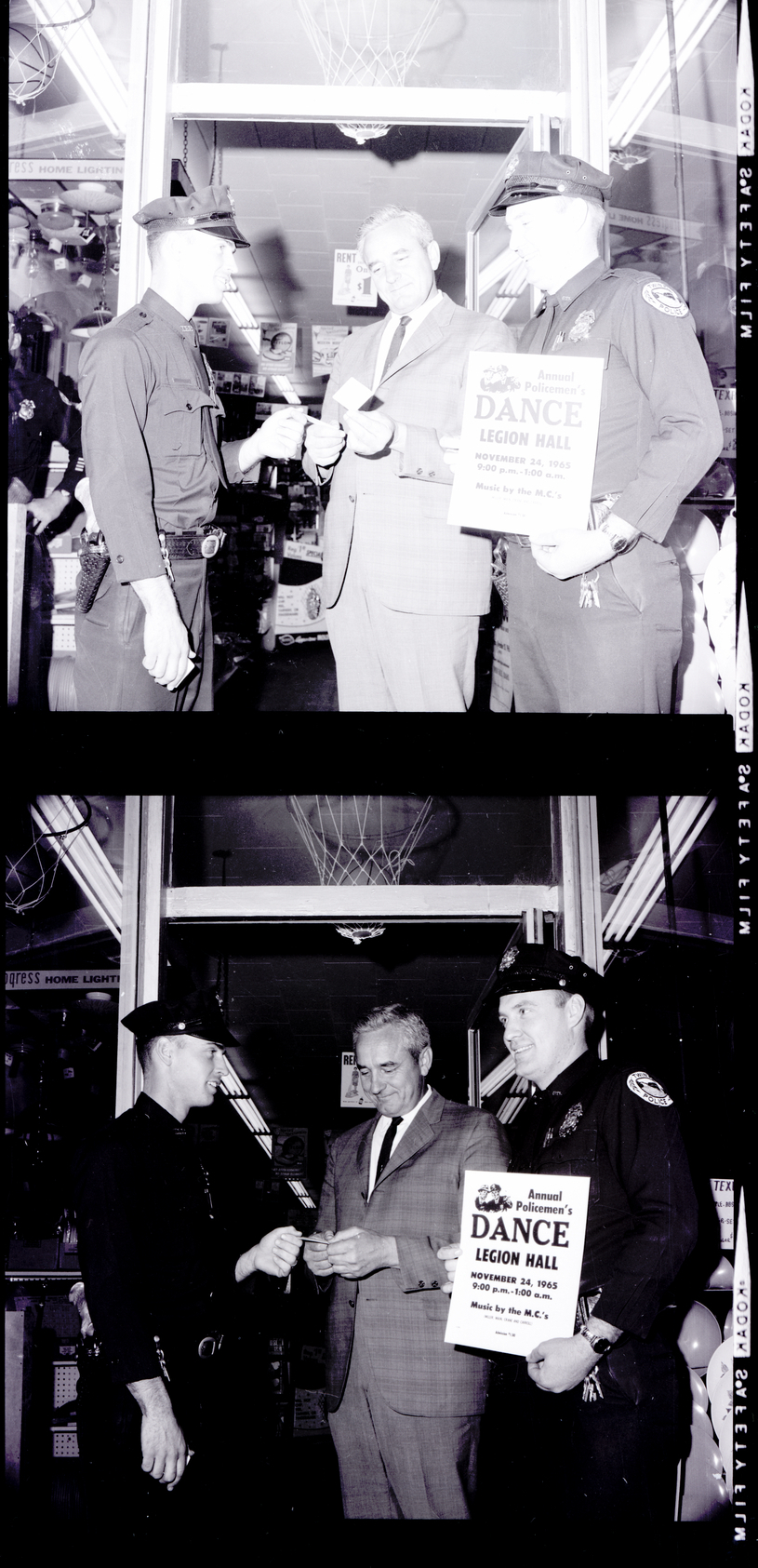 Rudy Ashenbrener buys a ticket to the annual TFPD Policeman's Ball from Patrolman Jerry Packer. Patrolman Gary Bates holds up a sign reading "Annual Policeman's Dance, Legion Hall, November 24, 1965, 9:00 p.m. - 1:00 a.m. Music by the M.C.'s. Admission $1.00." Mr. Ashenbrener is dressed in a suit and tie and the officers are wearing their uniforms. A gymnasium with a basketball hoop overhead is seen in the background.