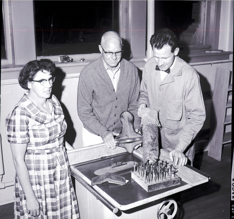 Items and tools used for woodworking and leathercraft are displayed by Mrs. R. O. Jacky and Walter Olson, two enrollees in a Twin Falls Recreation Department-sponsored adult leathercraft and woodworking class. Ray Beaumont, instructor of the course, admires the items. Mrs. Jacky is dressed in a plaid dress, Mr. Olson wears a button-up sweater, and Mr. Beaumont wears a bow tie and work coveralls. On the table is a saw, knives, a leather wallet, a wooden ornament, and a log with the image of an elk carved into it.