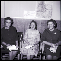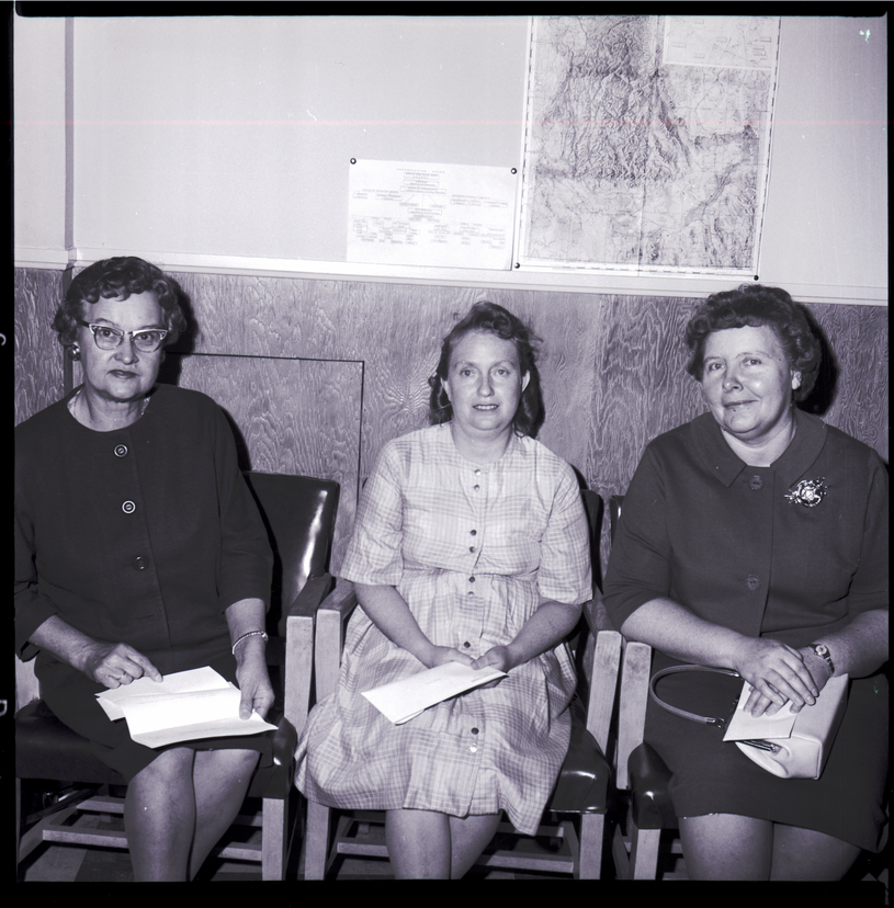 Mrs. A. B. Paris, Mrs. Juanita Kinney, and Mrs. Laura Holman are winners in the Thanksgiving drawing sponsored by Twin Falls downtown merchants. Mrs. Paris won first prize of $100 worth of merchandise, Mrs. Kinney won $50 worth of merchandise, and Mrs. Holman won $25 worth of merchandise. The three women are wearing dresses, and they are seated and are holding their award certificates in their laps. A map of Idaho is on the wall behind them.