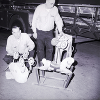 Repairing broken toys to be given for Christmas to underprivileged children are TFFD firemen James Miller, left, and Herman Carlton. Mr. Miller works on repairing a baby carriage, while Mr. Carlton works on repairing a toy car. A rocking horse is in front of them. A fire engine is in seen in the background.