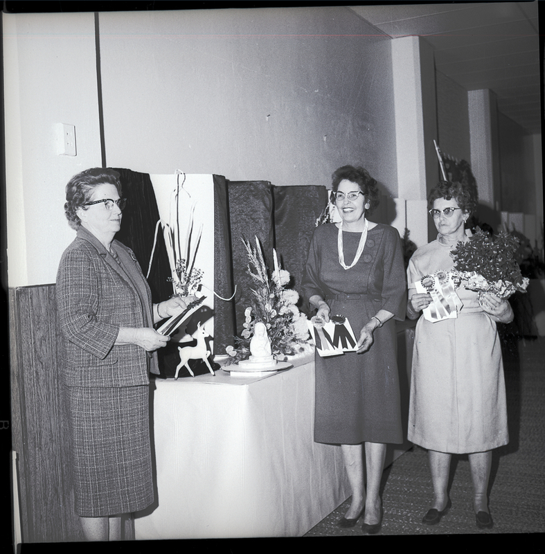 topiary tree display. Mrs. Nelson, sweepstakes winner for the most first prizes in artistic division, received the tricolor for best arrangement with fresh material predominating. Mrs. Hawkins won sweepstakes ribbons in the horticulture division. The three women are wearing dresses, and a table beside them has different floral displays and figurines on it.