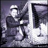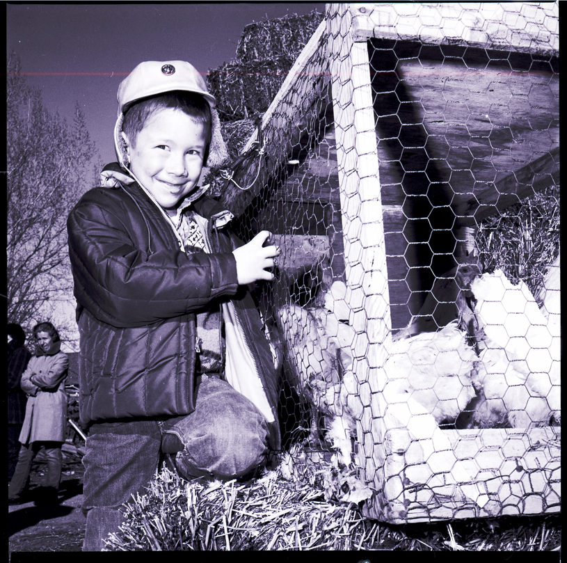 Four-year-old Dennis Johnson, looks at a cage of white hens at the auction at the farm estate of the late Howard Lapray. He is wearing a coat and a hat with ear flaps. A standing woman, some trees, and a stack of hay bales are in the background.