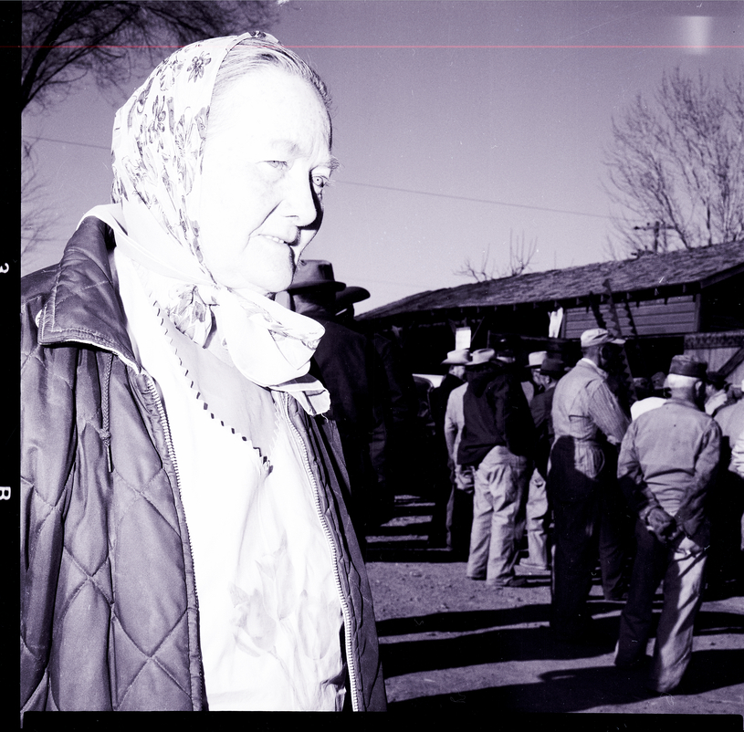 - Mrs. Howard Lapray stands to one side of the auction crowd listening to the sounds of auction on the farm estate of her late husband. She is wearing a coat and a scarf over her head. A crowd of men, a house, and some trees are in the background.