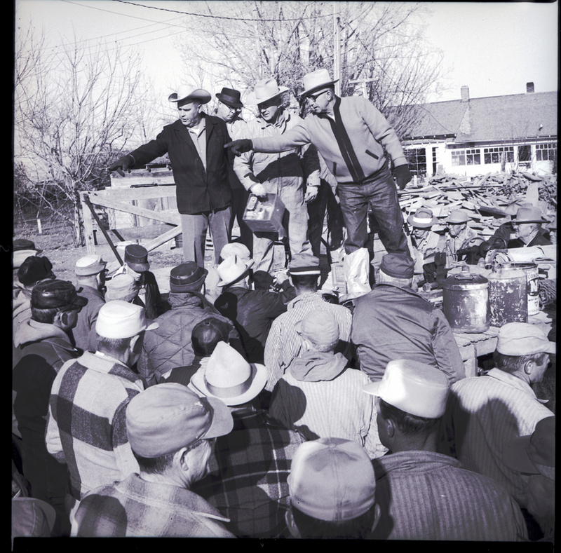 Auctioneers Harold Klaas, left, and Joe Duffek, point to one of several bidders seeking a box full of assorted cans. The accumulated equipment from more than forty years of farming by the late Howard Lapray was sold at auction at his estate's farm sale, north of Filer. The auctioneers stand on a platform, dressed in coats and cowboy hats, and a crowd of men surround it. A house and some trees are in the background.