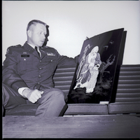 Captain Ray Young sits on a couch in his military uniform after returning to Twin Falls from the war in Vietnam after serving there for eleven months. On the couch beside him is a Vietnamese painting depicting an old man with a long beard holding a staff, a young boy holding a peach, and a deer. The painting was a gift from Captain Dinh, a Vietnamese air force pilot, whose father was one of three engineers aboard a train which was blown up by Viet Cong and taken by the enemy to the town of Muong Maun. Capt. Young, Capt. Dinh, and a helicopter crew flew into the area and brought the three engineers to safety. He received the painting as a reward during a party given by a Vietnamese fighter squadron.