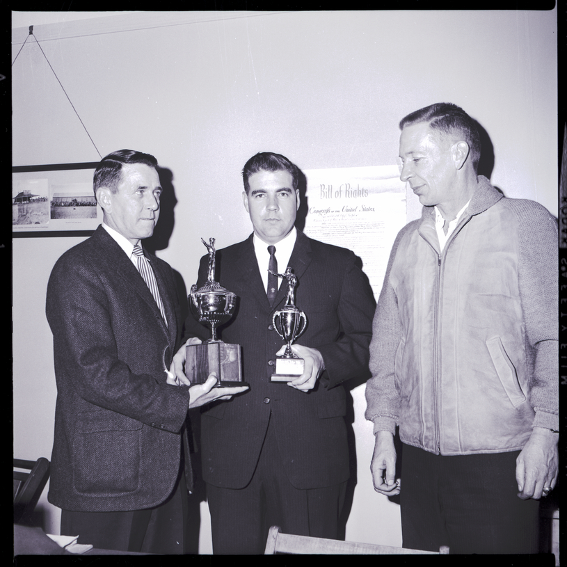 The high point aggregate scorer for the Twin Falls Police Department pistol competition, Cloyce Edwards, center, displays the trophies he won to O. J. Smith, left, and Police Chief Frank Barnett. Smith, city editor for the Times-News, presented the trophies on behalf of the Times-News, which sponsors the trophies each year. On the wall behind them is a poster of the Bill of Rights and a framed photograph.