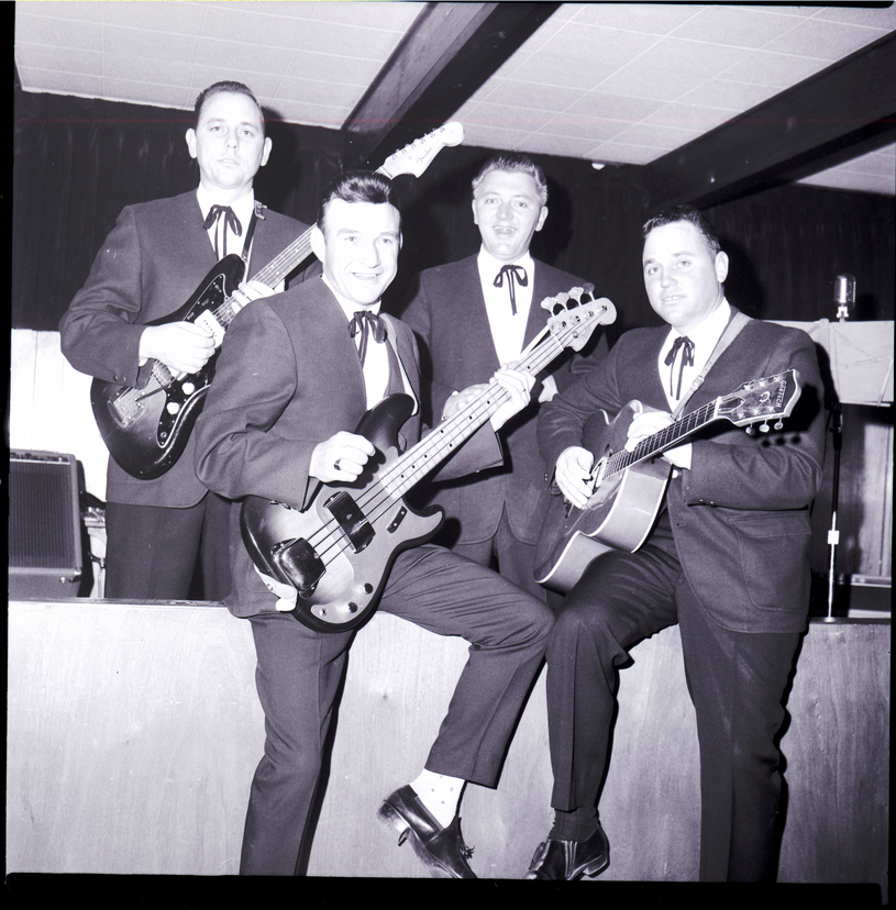 The Walden Brothers appear at the fifth annual Country Music Jamboree, held at Filer High School auditorium. From left to right are Junior Walden, lead guitar, Frank Herman, bass, Harry Hansford, drums, and Loy Walden, rhythm guitar. They are dressed in suits and western bow ties and holding guitars. A speaker and a microphone are visible on the stage behind them.