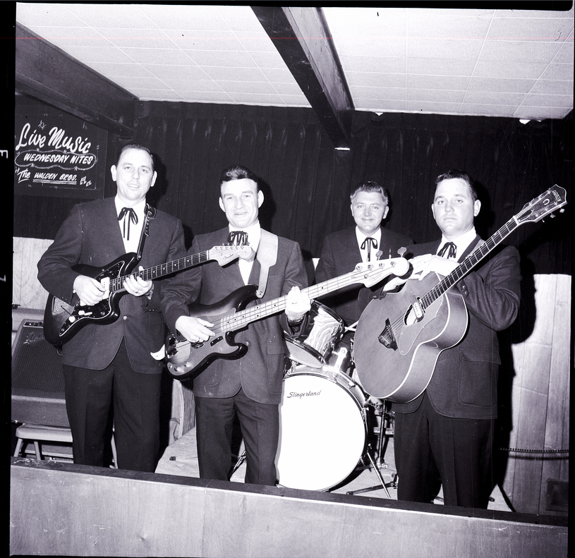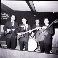 The Walden Brothers appear at the fifth annual Country Music Jamboree, held at Filer High School auditorium. From left to right are Junior Walden, lead guitar, Frank Herman, bass, Harry Hansford, drums, and Loy Walden, rhythm guitar. They are dressed in suits and western bow ties and holding guitars. Mr. Hansford is seated at a drumset. A speaker is visible on the stage behind them. A sign hangs behind them reading "Live Music Wednesday Nights The Walden Bros."