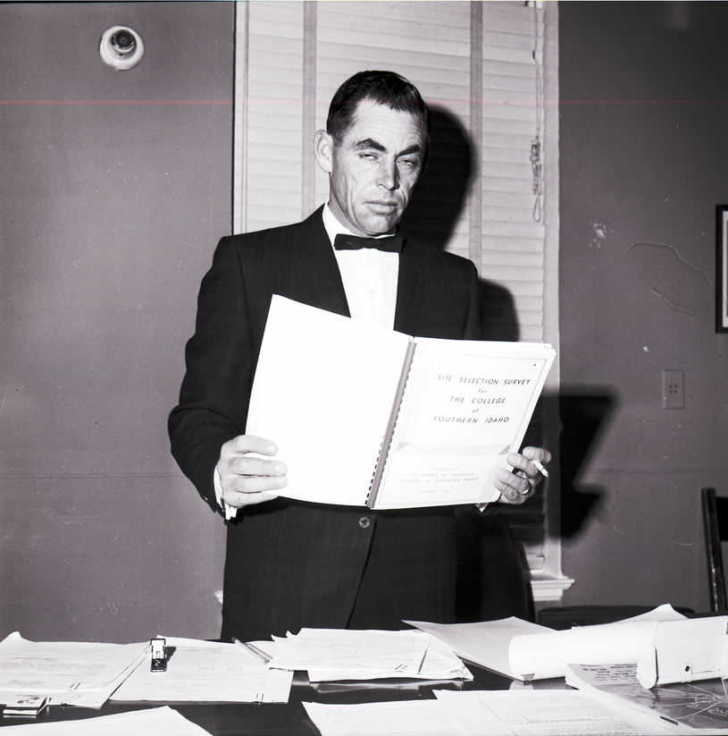 Robert Blastock Jr., College of Southern Idaho board of trustees chairman, stands in an office reviewing a site survey report for the new college. The front of the booklet reads "Site Selection Survey for the College of Southern Idaho. Prepared for the Board of Trustees, College of Southern Idaho, February 1966." He is dressed in a suit and bow tie and holds a cigarette between two fingers. On top of the desk in front of him are several piles of papers held together with paperclips, a stapler, and a book of matches.