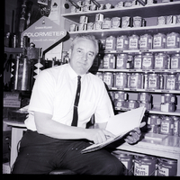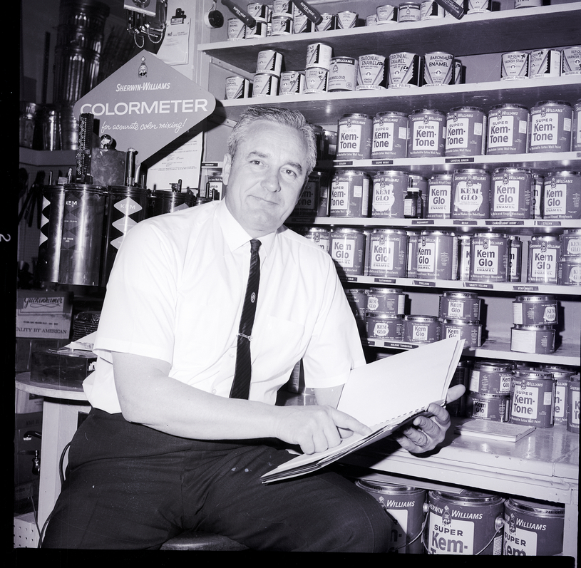 Rudy Ashenbrener, commanding officer of the local Air Force reserve unit, sits on a stool looking at a spiral-bound book in Price Hardware after returning from a tour of Air Force and NATO installations in Europe with the United States Air Force. He is dressed in a shirt, tie, and slacks. Behind him are several shelves holding cans of paint, and a display sign hangs on the wall reading "Sherwin-Williams Colormeter for accurate color mixing!"