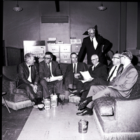 Others are, from left to right, Dorsey Riggs, Dean Charles Hegel, Dr. John Green, Dr. H. W. Steffens, Dr. Vail Foy and Dr. Elmer K. Raunlo. They are dressed in suits and ties. Some coffee cans holding papers are on the ground in front of them. In the background is a candy machine and some file cabinets.