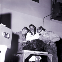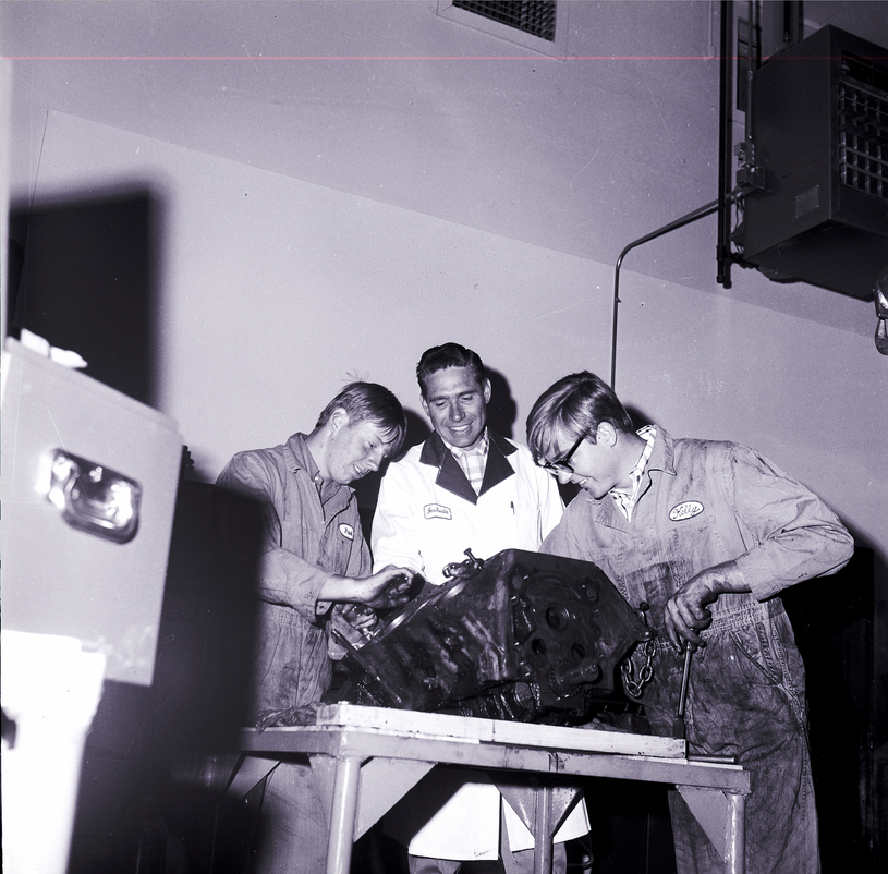 Engine block trouble is inspected by Paul Dodge, left, and Kelly Carpenter, right, as auto mechanics instructor Paul Hoppe watches in the new Auto Mechanics laboratory section of the College of Southern Idaho's vocational school. The three men are wearing coveralls. Some file cabinets are to the side.