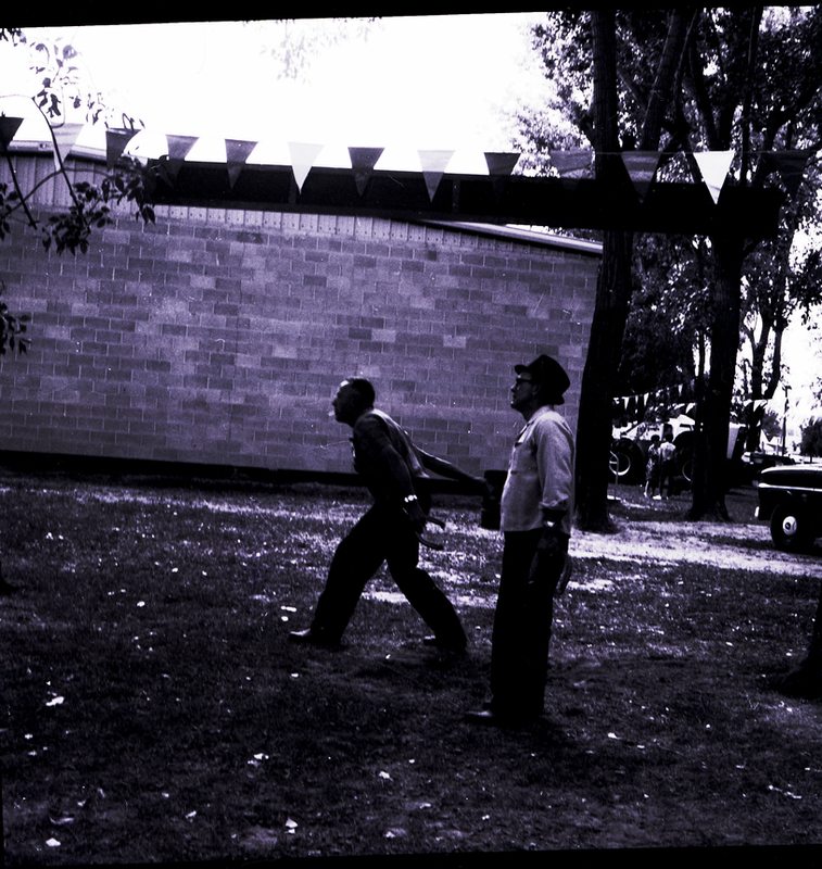 - Two men throw horseshoes at the Twin Falls County Fair. One of the men is wearing a bowler hat. Behind them is a brick wall, and pennants hang from a banner above them. In the distance are some trees and parked cars.