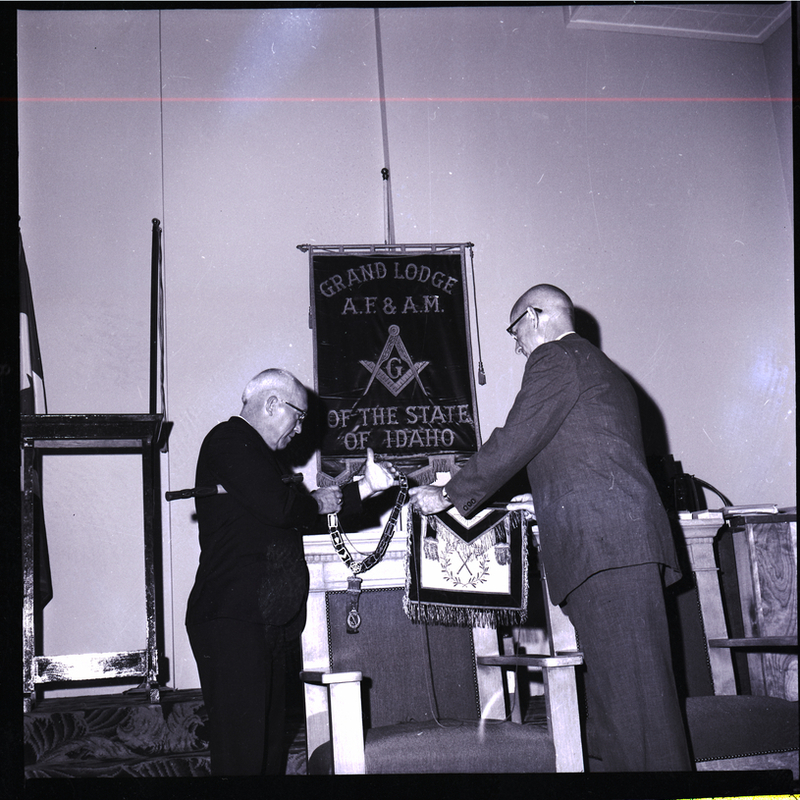 Arranging collars and aprons for the opening of the 99th Annual Communication of the Grand Lodge of Idaho are W. G. Pyrah, grand marshal, left, and A. T. Kauffman, right. A banner above their display reads "Grand Lodge A. F. and A. M. of the State of Idaho." Two chairs sit in front of the display. A flag stands to the side of the stage.
