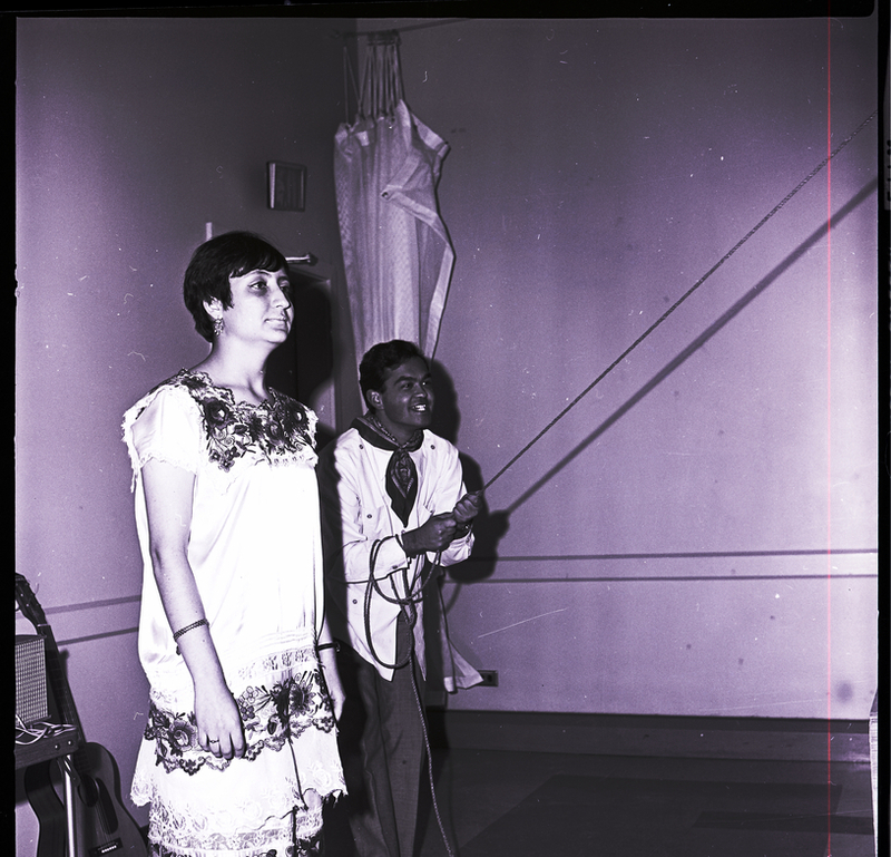 A young man with a bandanna around his throat holds the rope of a hanging pinata at a Mexican posada held at the YM-YWCA building for host families of eleven Mexican youths visiting Twin Falls as part of the Experiment in International Living program. A woman in a dress stands beside him, watching. Leaning against the wall behind them is a guitar.