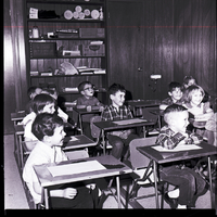 Several children sit at desks in a classroom at Children's Village, a Montessorian method pre-school in Twin Falls run by Mrs. Charles Hopkins. The kindergarten-aged children have graduated from nursery tables and chairs into the scaled-down desks. Each desk has a long paper on top of it. In the back of the room is a bookcase that is filled with boxes and various supplies. A door and a water fountain are in the corner of the room.