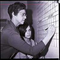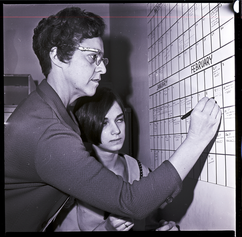 Dr. Adele Thompson keeps track of her many CSI activities on a wall calendar. Ilene Campbell stands beside her, looking at the schedule. The wall calendar shows her busy schedule during the months of November through February.