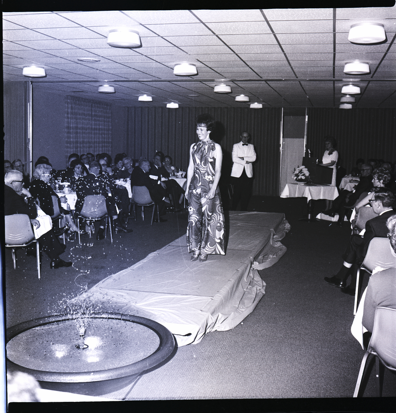 A woman models a patterned sleeveless dress at a fashion show during the Filer Kiwanis Club Ladies' Night held at the Twin Falls Holiday Inn. She walks down a runway with a fountain at the end. Several people sit in chairs at the side of the room, watching. At the back of the room is a table covered in a white tablecloth with a bouquet of flowers on top, and Mrs. Morris Carlson, the narrator of the event, stands behind it.